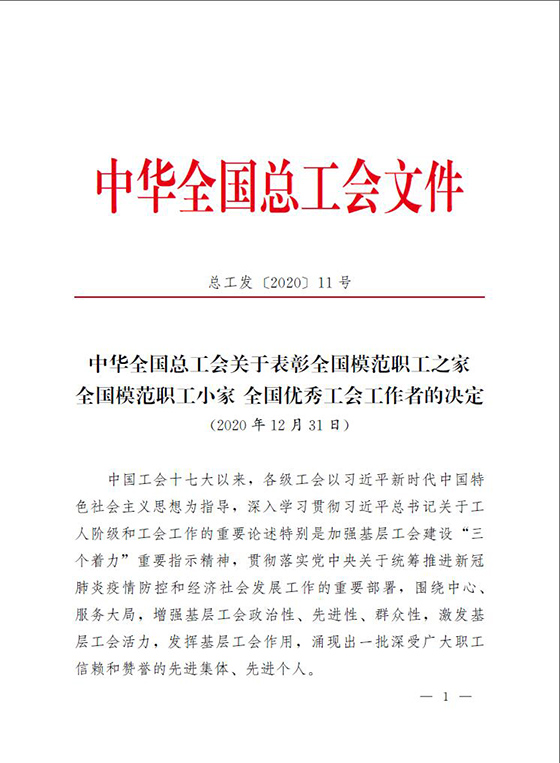 我公司圖形處理部獲得2020年全國模范職工小家榮譽稱號