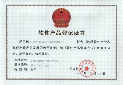 2013年11月29日,我公司研發(fā)的GC物流信息管理軟件、GC汽車圖檔管理軟件、GC汽車4S店客戶信息管理軟件順利通過河北省軟件評測中心評測,并獲得了河北省工業(yè)和信息化廳頒發(fā)的軟件產(chǎn)品登記證書。
