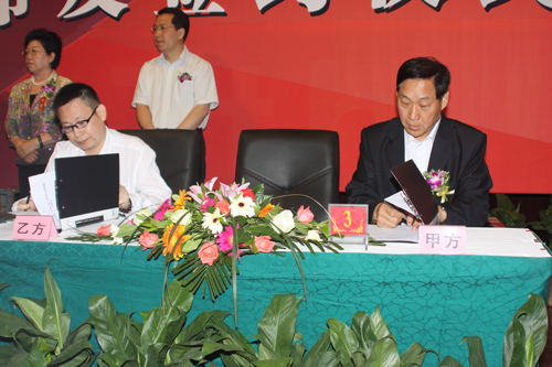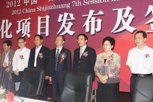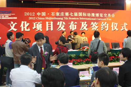2012年9月29日上午,中國·石家莊第七屆動漫博覽交易會文化項目簽約及發(fā)布儀式在石家莊國際科技博覽活動中心舉行。簽約儀式上,我公司董事長劉占查與香港力豐控股有限公司董事長李浩翰分別代表簽約雙方成功簽署辛集信息產業(yè)基地建設項目,簽約額30億元。石家莊市副市長程凱、人大常委會副主任李屏東、市政協(xié)副主席朱增海到會祝賀并與簽約雙方合影。